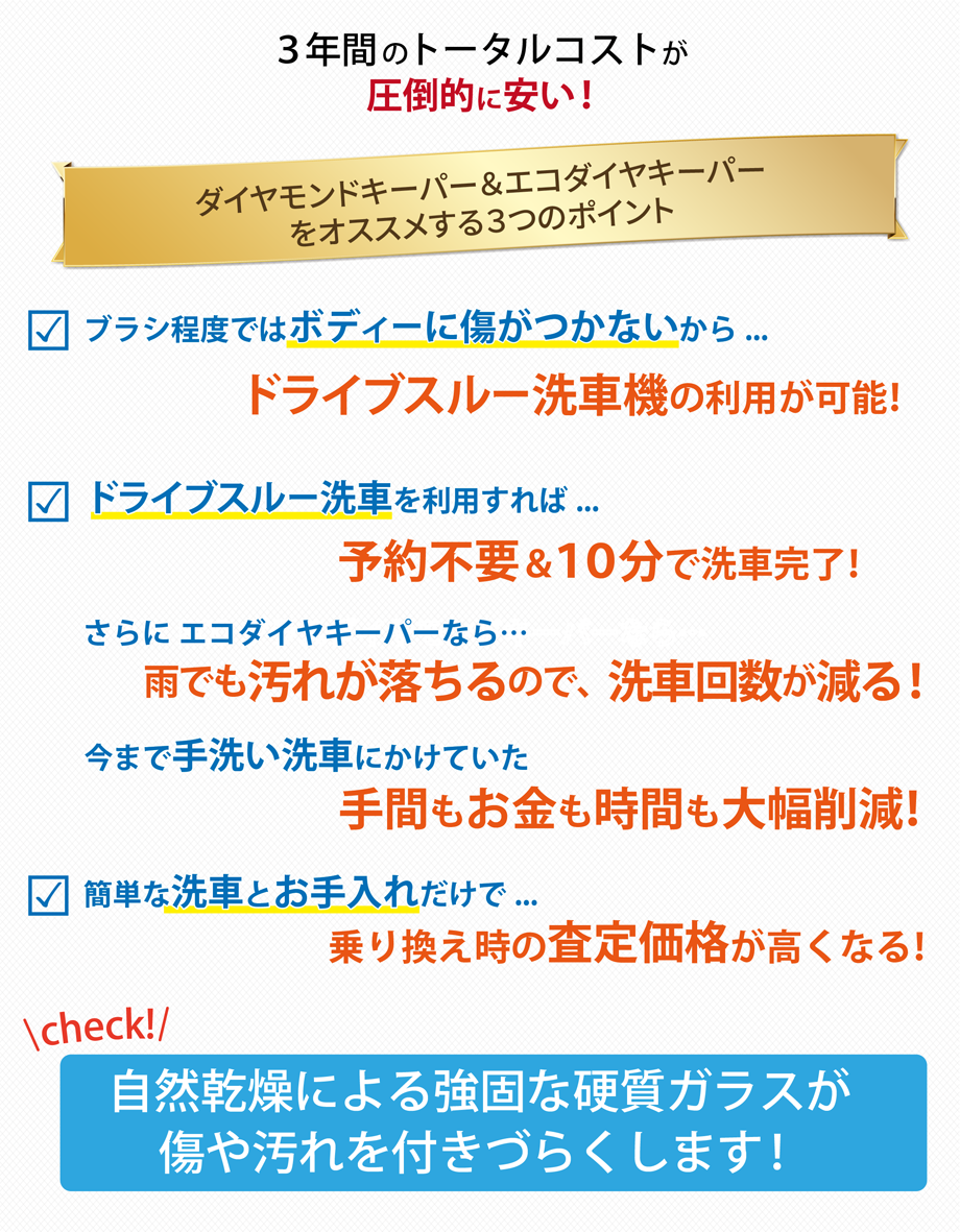 エコダイヤモンドキーパーなので、雨に振られても天然の洗車だと思えるようになりました。これで5年間(メンテナンス含む)は綺麗な車に乗れます。